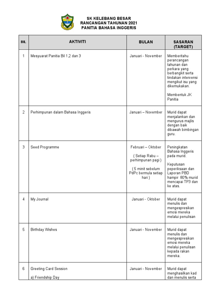 Rancangan Tahunan Panitia Bi Skkb 2021 Pdf